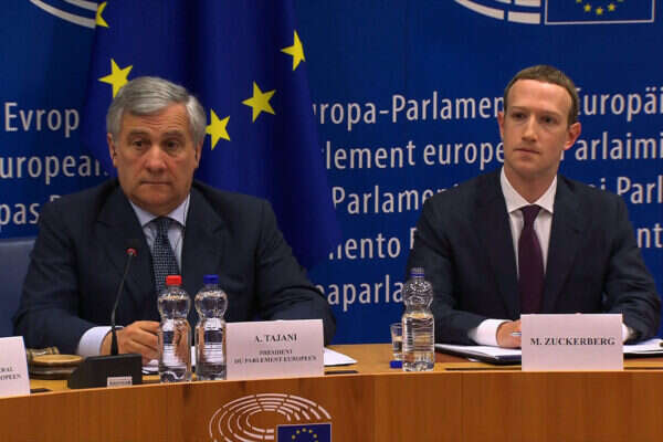 מנכ"ל פייסבוק מארק צוקרבג ונשיא הפרלמנט האירופי אנטוניו טאחאני בפגישתם במאי האחרון. למחוקקים נמאס // צילום: AFP