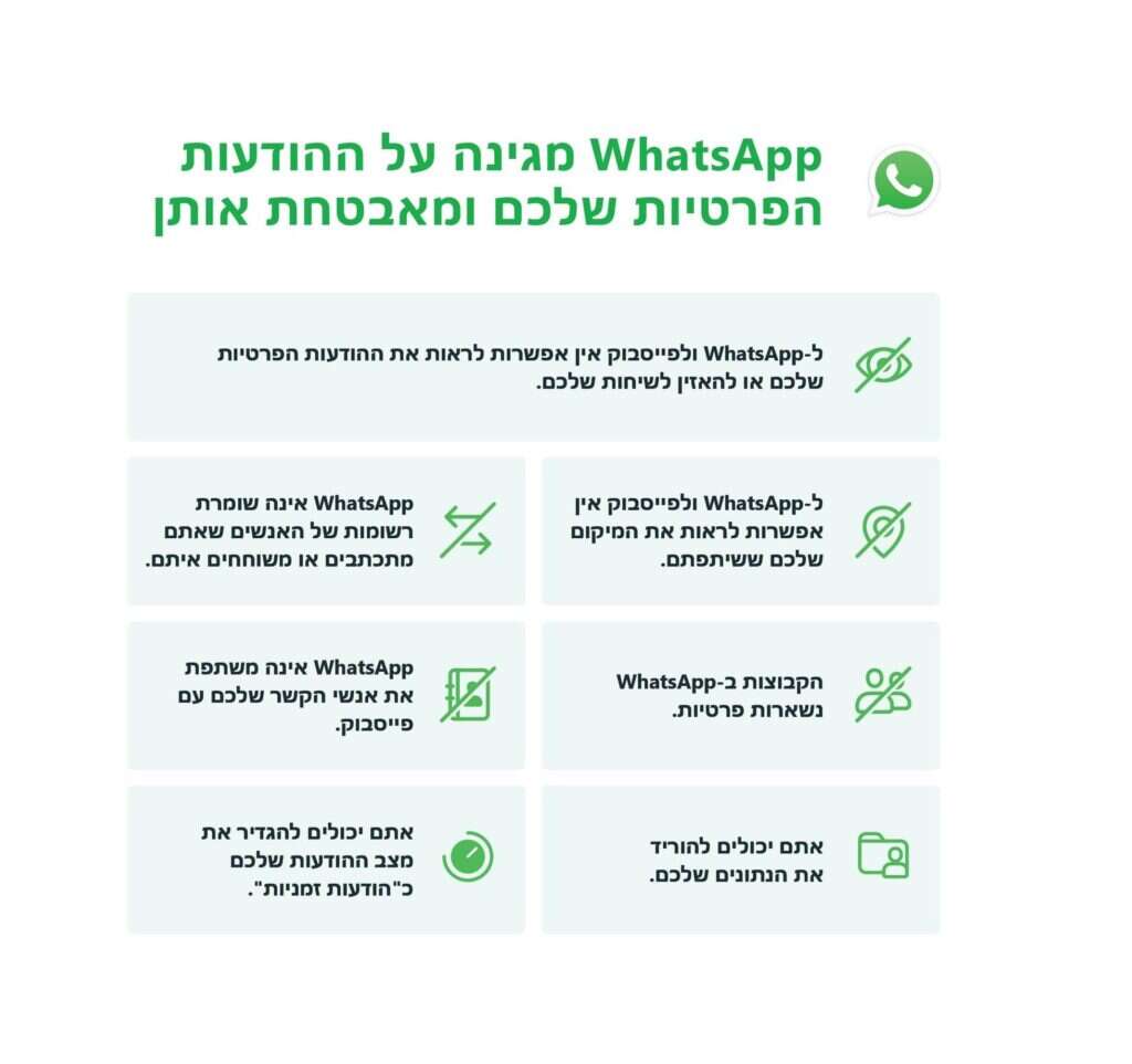 וחשוב לציין: מאחר שוואטסאפ עושה שימוש בהצפנה מקצה-לקצה, החברה לא תחשוף, תפרסם או תצפה בהודעות, ולא תאזין לשיחות. מנגד, היא כן תשתף מידע אחר – כמו מספר טלפון, סטטוס (אם קיים), מידע על ההתחברות האחרונה שלכם לשירות וסוג המכשיר בו את עושים שימוש.