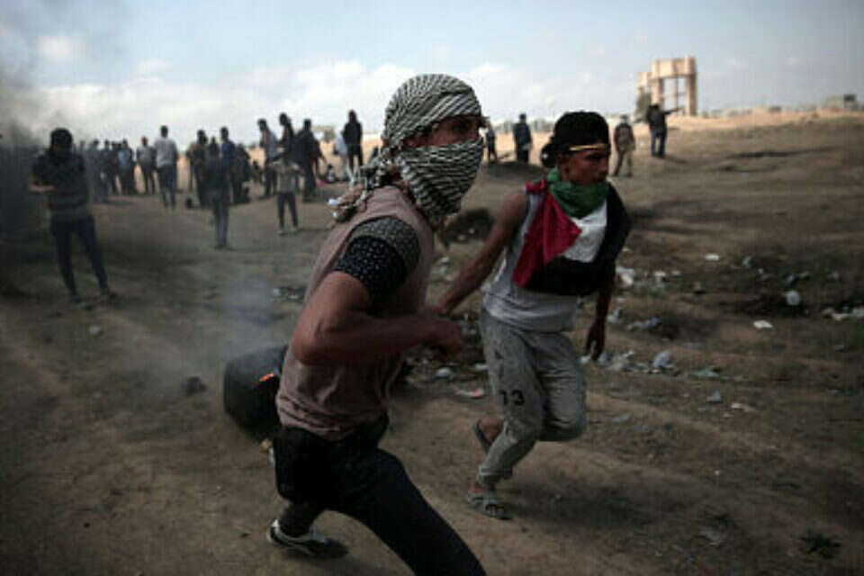 פלשתינים מתפרעים על גדר הגבול // צילום: אי.פי