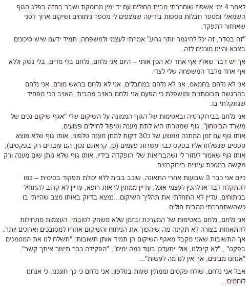 "יש דבר שאליו אף אחד לא הכין אותי – היום אני נלחם, בלי מדים, בלי נשק וללא אף אחד מלבד המשפחה שלי לצדי. אני לא נלחם בחמאס, אני לא נלחם במחבלים, אני לא נלחם בראש מורם. אני נלחם בהרגשה תבוסתנית ומושפלת כי הפעם אני נלחם באויב מהבית, האויב הכי מפחיד שנתקלתי בו. אני נלחם בבירוקרטיה ובאטימות של הגוף הממונה על השיקום שלי 'אגף שיקום נכים של משרד הביטחון'. גוף שמטרתו היא לתת מענה וטיפול לחיילים פצועים", כתב לוחם המילואים.