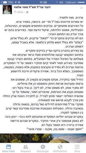 במקביל לדבריו של ראש הממשלה התיייחס גם דובר צה"ל תא"ל מוטי אלמוז, בעמוד הפייסבוק שלו גם הוא לתגובות לתקרית :