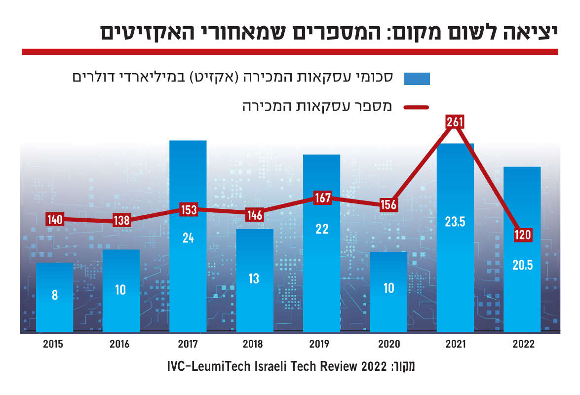 על פי דו"ח SNC, ירד מספר עסקאות ההשקעה ב־25% - מ־1,103 סבבים ב־2021 ל־826 סבבים ב־2022. מספר האקזיטים ירד, על פי IVC, ב־44% - מ־158 עסקאות ב־2021 ל־89 עסקאות ב־2022. ההיקף הכספי של האקזיטים ירד ב־33% - מ־7.8 ל־5.3 מיליארד דולר. מספר ההנפקות נפל בחזרה לרמות של העשור הקודם, וב־2022 הוא עמד על 18 הנפקות לעומת 76 הנפקות ב־2022.
