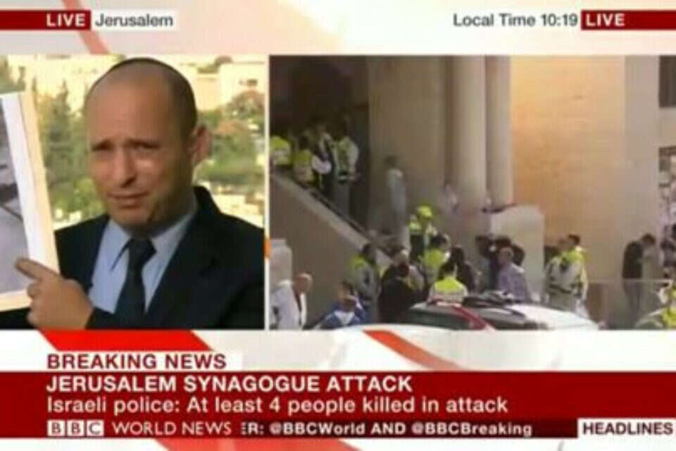 התקשורת העולמית הביעה הבוקר עניין רב בפיגוע הרצחני שאירע בבית הכנסת בשכונת הר נוף, אולם לא כפי שהיינו מצפים. יו"ר הבית היהודי השר נפתלי בנט התראיין לרשת BBC הבריטית, ועלה לשידור לאחר מרואיין פלשתיני שהסביר כי "היהודים הם אלה שרוצחים את הפלשתינים בירושלים". בתגובה, בנט הציג תמונה מזירת הפיגוע מול מחאות המראיינת, שדרשה ממנו להסיר את התמונה "אנחנו לא רוצים לראות את זה" אמרה לו.