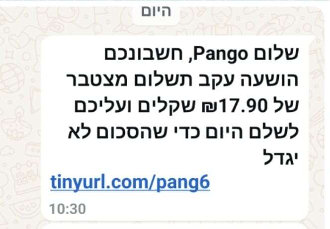 בשיחה עם "ישראל היום" מספר א' מתל אביב: "אשתי קיבלה את ההודעה הזו הבוקר ואמרה לי שהיא מתכוונת לשלם באופן מיידי בגלל שנחסמנו לכאורה מפנגו. אמרתי לה שזה נשמע לי משהו מאוד חשוד. אם נכנסים ללינק וממלאים מה שמבקשים - הם מקבלים את פרטי האשראי ויכולים להשתמש בו. חוץ מזה, האפליקציה מתריעה למי שיש חוב".