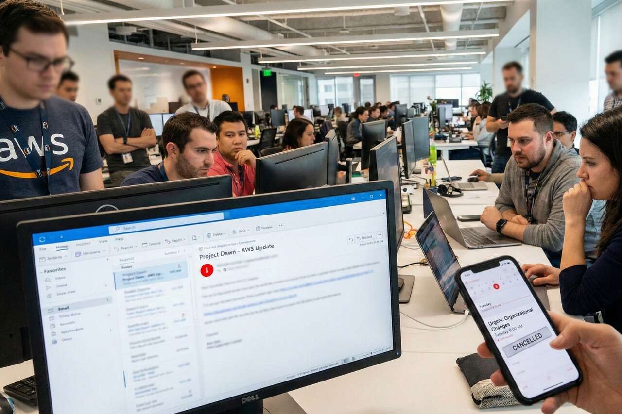 על פי דיווחים ב-Reuters וב-CNBC, המייל נשלח מטעמה של קולין אוברי, סגנית נשיא בכירה לפתרונות AI ב-AWS. המייל התייחס למהלך הפיטורים תחת שם הקוד הפנימי "Project Dawn", וציין כי עובדים המושפעים מהקיצוצים בארה"ב, קנדה וקוסטה ריקה "כבר קיבלו הודעה על סיום העסקתם". בפועל, באותו רגע, שום הודעה רשמית לא נמסרה לעובדים אלו.