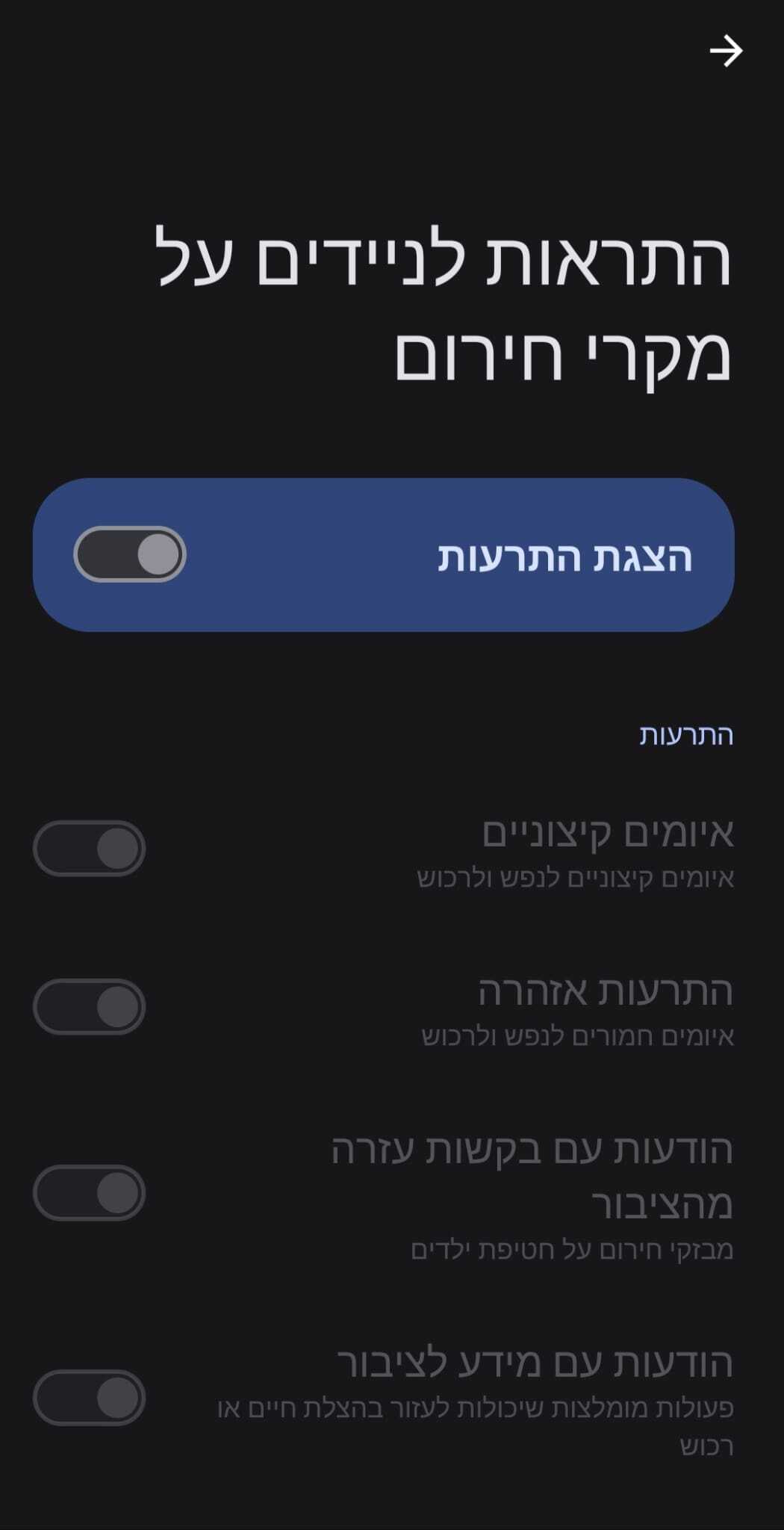 תחת מקטע "התראות חירום", כבו את המתגים של התרעה קיצונית ו-התראת בטיחות הציבור.