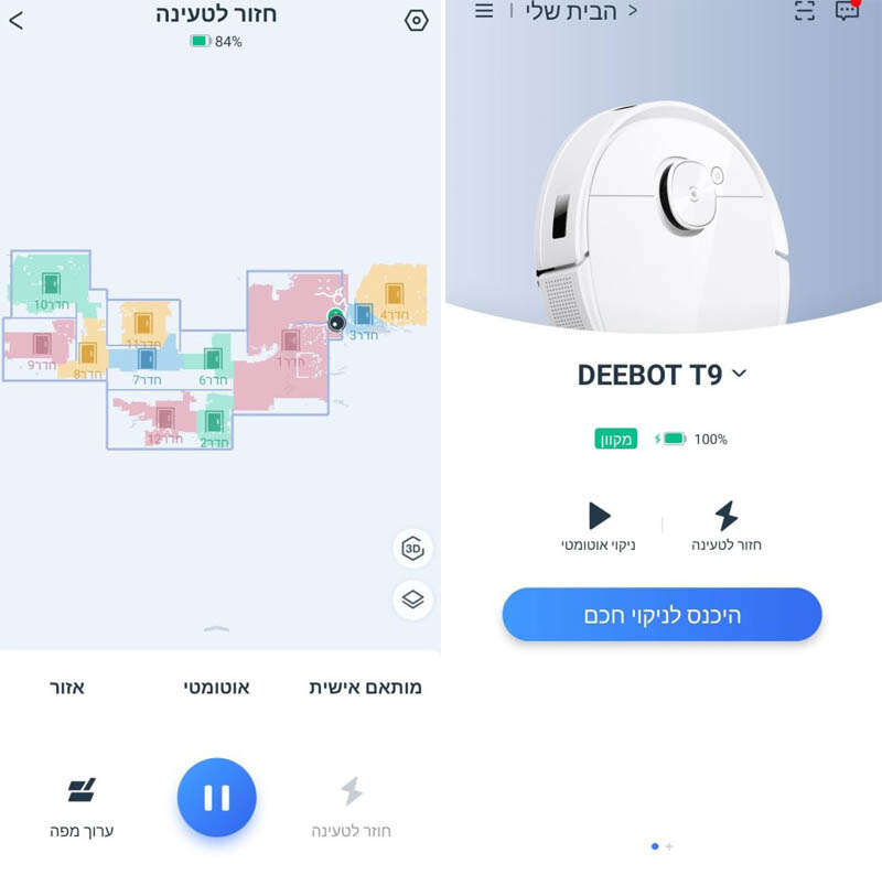 השליטה ב-Deebot T9 מתבצעת בעיקרון רק דרך האפליקציה, למרות שיש כפתור פיזי להפעלה על גבי הרובוט עצמו, שלא ממש נגעתי בו. האפליקציה של החברה מגיעה בממשק בעברית והיא מאפשרת ישירות מעמוד הבית שלה לבצע ניקוי אוטומטי של כל הבית או להחזיר את הרובוט לתחנת העגינה בלחיצת כפתור בודדת. הפתרון הזה מתאים, כאשר רוצים לשלוח את הרובוט לניקוי ואין זמן להתעסק עם האפליקציה, אבל ברגע שנכנסים לעמוד ההפעלה העיקרי של האפליקציה מגלים את כל האופציות החכמות, כמו מיפוי של הבית, המתבצע באופן אוטומטי לאחר הפעלה ראשונית של ה-Deebot T9.