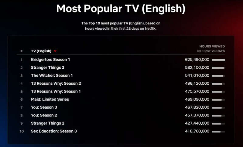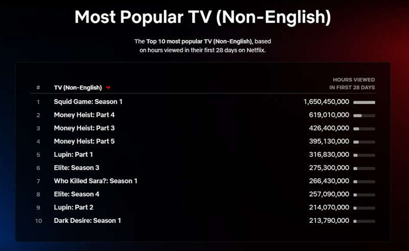 הרשימה תכלול למעלה מ-90 מדינות והיא בודקת גם אחורה עד ל-28 ביוני. בנוסף, ניתן לראות סטטיסטיקות מעניינות לגבי נתוני הצפייה של כל התכנים בחודש הראשון להצגתם. כאן "משחק הדיונון" משאיר אבק לכל יתר התכנים עם למעלה ממיליארד וחצי צפיות בחודש הראשון בלבד.