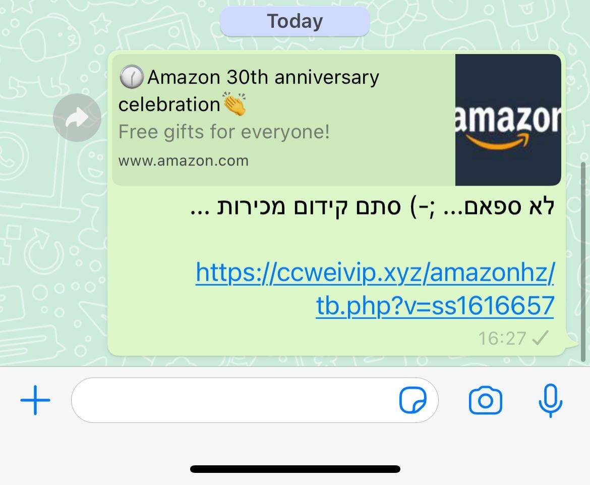 גל הפישינג נמשך: אם קיבלתם הודעת וואטסאפ המבקשת מכם ללחוץ על קישור כדי לקבל מתנה מאמזון לכבוד חגיגות ה-30 להיווסדה – אל תלחצו על הקישור, שכן מדובר בהודעה מזויפת מאחוריה עומד ככל הנראה ניסיון לקבלת פרטים אישיים עליכם ולרשום אתכם למאגר הודעות פישינג אחרות.