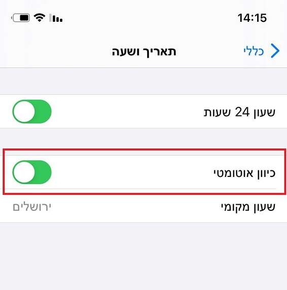 ודאו כי "כיוון אוטומטי" פעיל ותחתיו מופיע "ירושלים". אם לאחר הדלקת המתג לא מוצג "ירושלים" תחת "שעון מקומי" כבו את המתג, היכנסו לאפשרות "שעון מקומי, הקלידו "ירושלים" ובחרו אותה בתוצאות החיפוש.