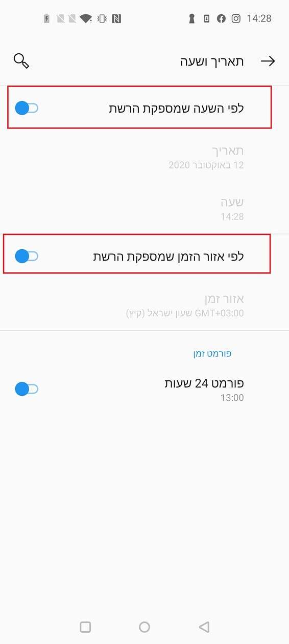 כעת, ודאו כי "לפני השעה שמספקת הרשת" דולק, וגם "לפי אזור הזמן שמספקת הרשת".