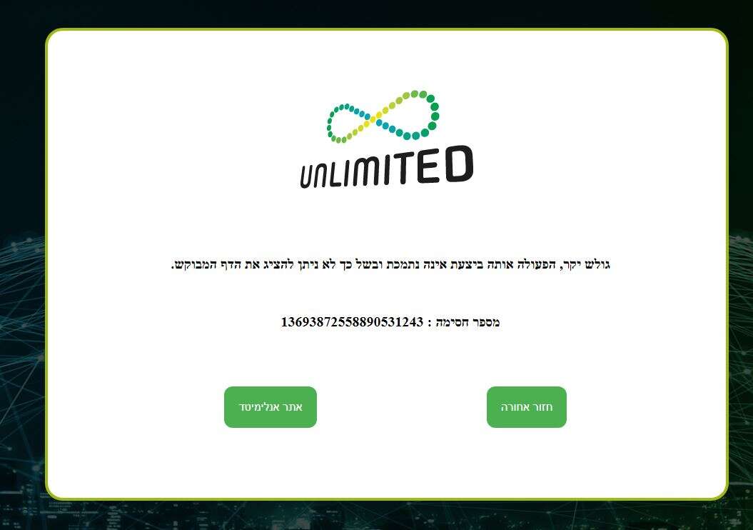מ-Unlimited נמסר בתגובה: "התקלה נפתרה וכעת כלל לקוחותינו מחוברים שוב לרשת הסיבים האופטיים שלנו. אנחנו יודעים שאתם נותנים בנו את האמון שלכם מידי יום ואנחנו מחוייבים לספק לכם את תשתית האינטרנט הטובה ביותר, בכל יום ובכל שעה. אנחנו מבטיחים לתחקר את האירוע ולעשות כל שביכולתנו שתקלות כאלו לא יישנו ושתוכלו להיות בטוחים שבחרתם בתשתית האינטרנט המהירה והאמינה ביותר בישראל".