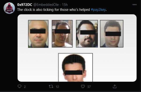 בתמונה שפרסם האקר אמש נראים חמישה פרצופים של גברים כאשר עיניהם מוסתרת בפס שחור, לצד הכיתוב: “השעון מתקתק עבור אלו שסייעו ל-Pay2Key”. בציוץ אחר הוסיף: "אל תחשבו ש-Pay2Key מקצוענים או מוכשרים, הם השתמשו בחולשת zerologon כדי לקבל גישה לשרת ה-DC של התעשייה האווירית – לא מרשים. זמנם הולך ואוזל”.