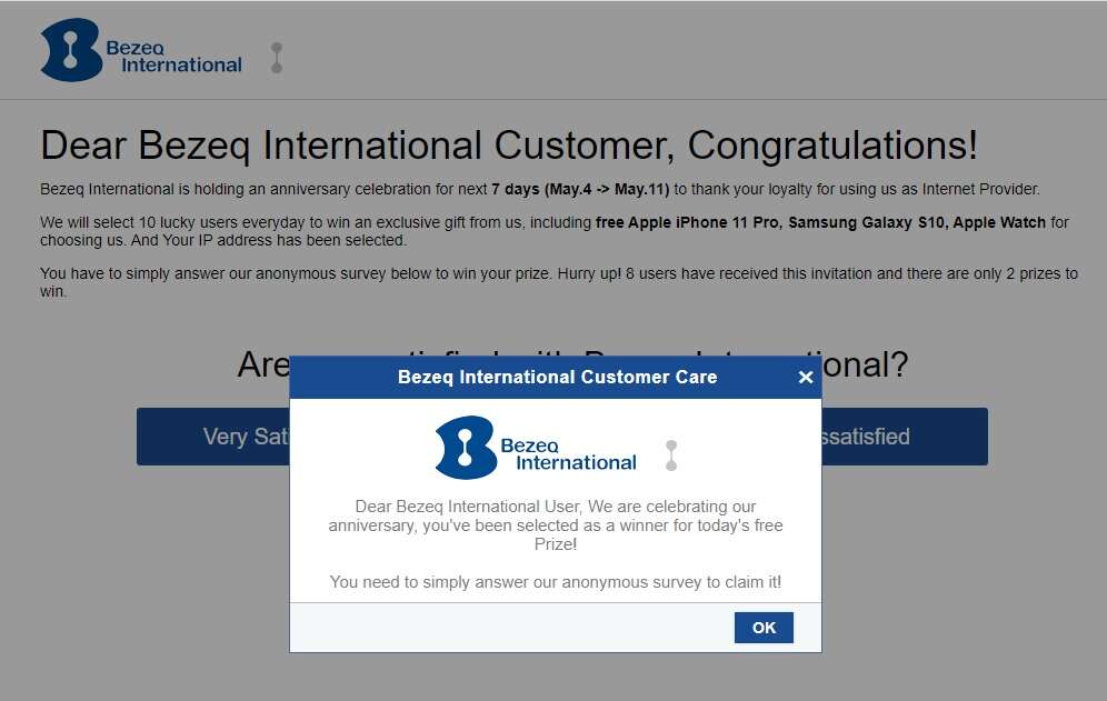 איך זה עובד? לאחר שתלחצו על "OK", הסקר יתחיל ויופיעו בו שאלות: "האם אתה מרוצה מהשירות של בזק בינלאומי, האם תמליץ על החברה".  לאחר מענה על הסקר, נערכת בדיקה שמראה לכאורה כי נותר רק אייפון 11 פרו לבחירתכם וכי יש לכם מספר דקות בודדות על מנת לאסוף את הפרס ולזכות בו.