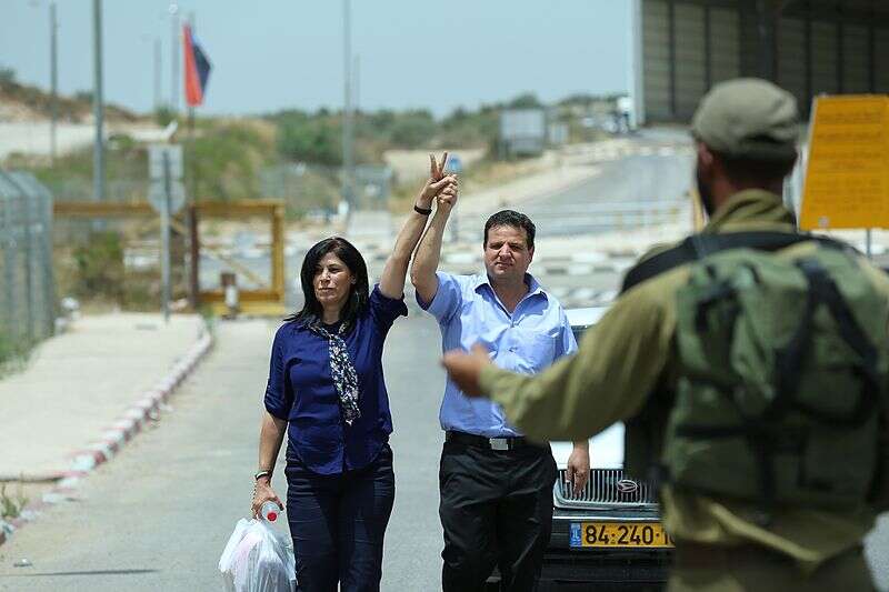 ראש הרשימה המשותפת איימן עודה תועד בעבר כשהוא מניף ידיים עם אחת העצורות מארגון הטרור החזית העממית, חליד ג'ראר. התמונה פורסמה ביוני 2016.