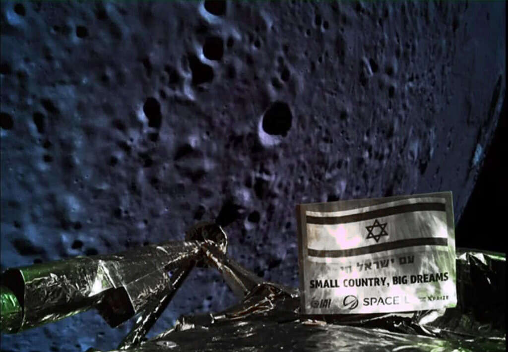 מדינה קטנה, חלומות גדולים. אחד הצילומים האחרונים ששלחה בראשית של פני הירח טרום הנחיתה. בלוחית סמלי SpaceIL, התעשיה האווירית ו-Xprize // צילום: SpaceIL/התעשיה האווירית