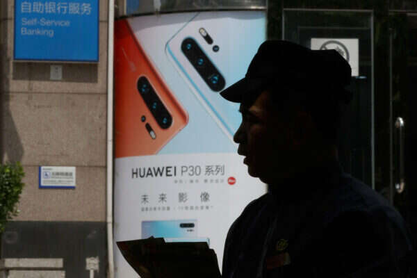 הצל שמטילה סין על וואווי. אזרח סיני מחלק פליירים על רקע פרסומות לטלפונים של וואווי בסין // צילום: איי. פי.