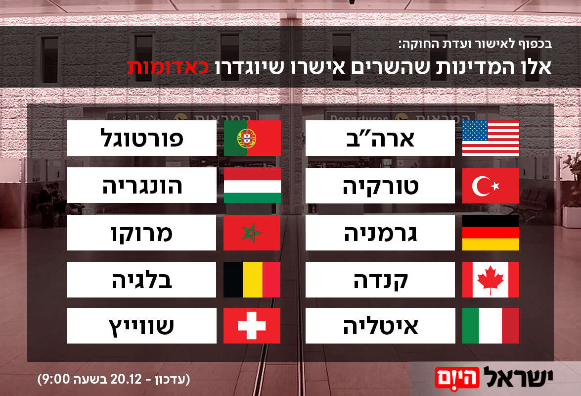 בהתאם, איטליה, ארה"ב, בלגיה, גרמניה, הונגריה, מרוקו, פורטוגל, קנדה, שווייץ וטורקיה - יוגדרו כאדומות החל ממחר - יום שלישי, 21 בדצמבר, בחצות (הלילה שבין יום שלישי ליום רביעי), בכפוף לאישור ועדת החוקה של הכנסת.