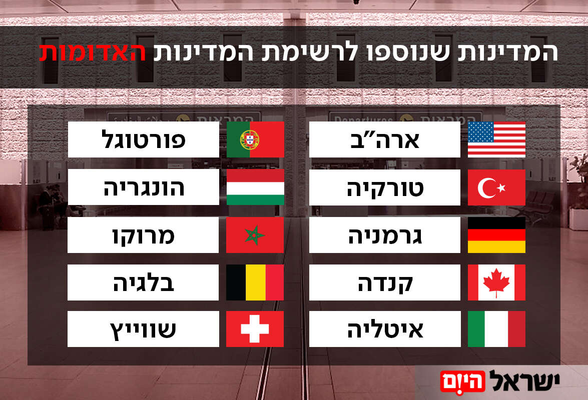 ועדת החוקה אישרה היום (שלישי) את הוספת ארה"ב, איטליה, בלגיה, גרמניה, הונגריה, מרוקו, פורטוגל, קנדה, שווייץ וטורקיה לרשימת המדינות האדומות שהיציאה אליהן נאסרה. רשימת המדינות החדשה נחשפה בשבוע שעבר ב"ישראל היום".
