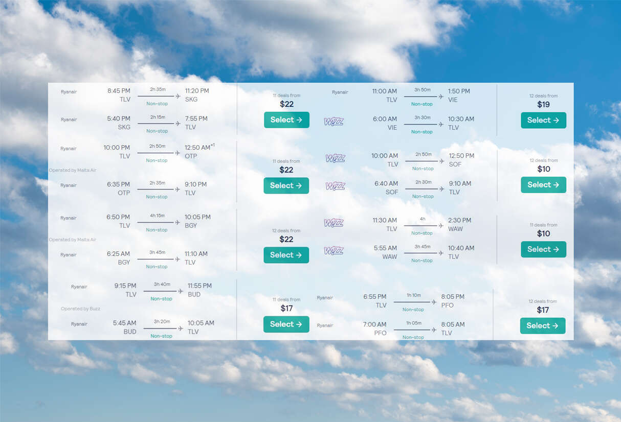 אם תרצו לטוס לווינה או לבודפשט, תוכלו למצוא טיסות ישירות של וויז אייר וראינאייר במחירים שנעים בין 17-19 דולרים לטיסות הלוך וחזור. תאריך הטיסה שמצאנו לבודפשט הוא 7-10 בפברואר, לווינה מצאנו בין התאריכים 6-9 בפברואר. גם כאן, יש תאריכים נוספים במהלך החודש במחירים דומים.
