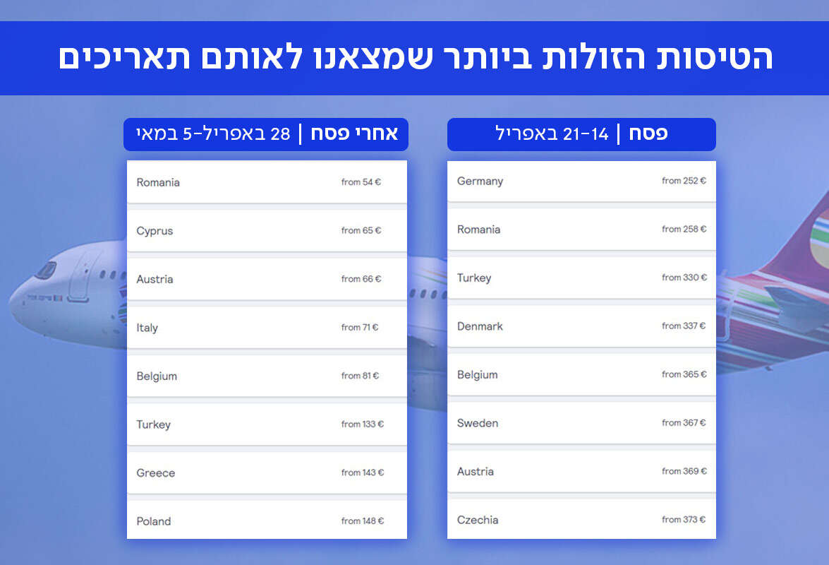טיסה ישירה לרומניה בפסח תעלה לכל הפחות 258 יורו לאדם, אם תמתינו שבועיים ותטוסו לרומניה אחרי פסח תשלמו 54 יורו בלבד, הבדל של יותר מ-200 יורו לכרטיס. כרטיס טיסה ישיר לאיטליה יעלה לכל הפחות 468 יורו בימי הפסח, אחרי פסח מחירי הכרטיס באיטליה יתחילו מ-71 יורו, פער של כמעט 400 יורו לכרטיס טיסה אחד.