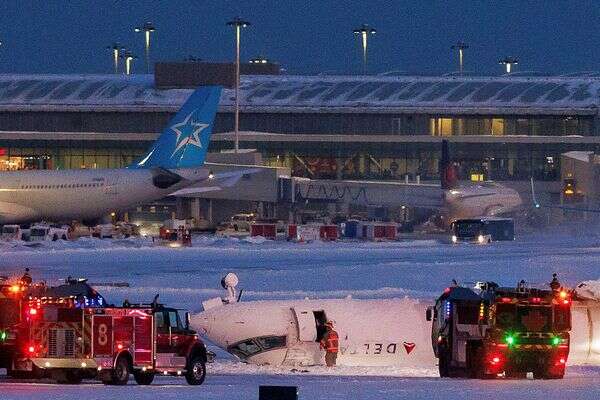 טיסת דלתא אייר ליינס ממיניאפוליס התרסקה והתהפכה על המסלול בנמל התעופה הבינלאומי טורונטו פירסון בעת שניסתה לנחות אתמול, האחרון בשורה של התרסקויות מטוסי נוסעים מאז דצמבר.