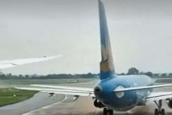 תאונה חריגה בין שני מטוסי נוסעים על מסלול הסעה בנמל תעופה: מטוס נוסעים פגע בזנב של מטוס אחר וחתך אותו, תוך כדי תנועה על הקרקע.