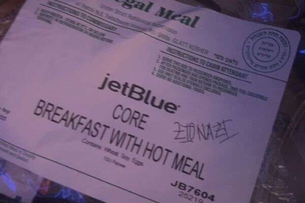 ארגון StopAntisemitism פרסם היום (שבת) בחשבון שלו ברשת X כי נוסע יהודי בטיסה של חברת התעופה האמריקאית JetBlue קיבל את המנה הכשרה שהזמין - כשעל האריזה נכתב בכתב יד הביטוי הפוגעני "ציונאצי". מדובר בשילוב של המילים "ציוני" ו"נאצי", שנחשב לכינוי אנטישמי מובהק.