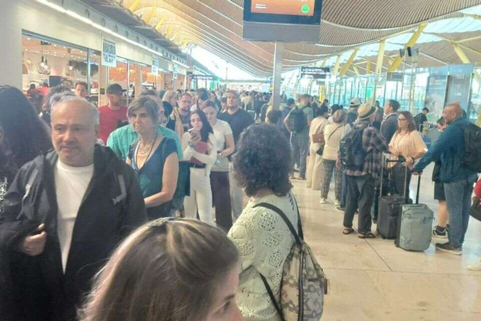 נוסעים שנחתו או המריאו היום (ראשון) מנמל התעופה אדולפו סוארס מדריד-בראחאס - שדה התעופה הגדול ביותר בספרד - נתקלו בכאוס מוחלט, עם תורים עצומים, המתמשכים עד מחוץ לאולמות, ועיכובים משמעותיים.