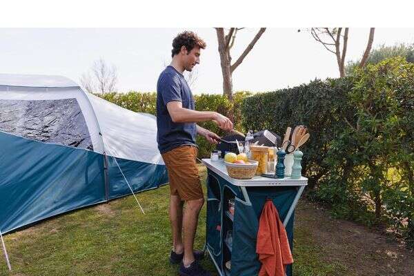 דקטלון מציעה יחידת מטבח גדולה לאתר קמפינג. היחידה כוללת גם חלל אחסון לסידור אביזרי המטבח, שתי רצועות אבזם להקמה קלה וכן מדפים נשלפים ותיק נשיאה עם ידית. המדף עמיד במשקל של עד 50 ק"ג.