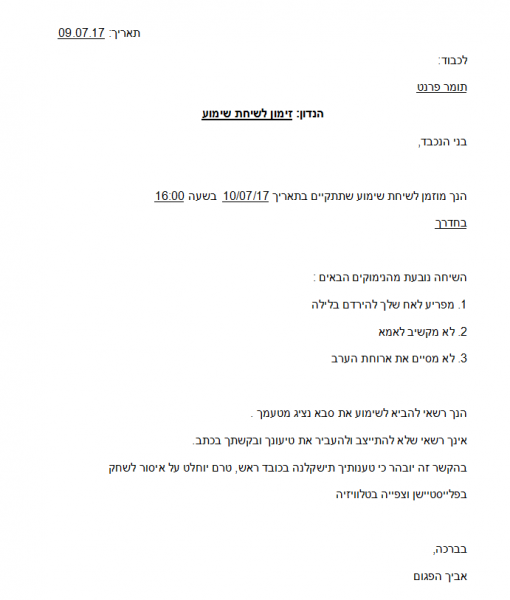 "התגובה של הילד הייתה פרייסלס. הוא היה בהלם ושאל אם אנחנו מפטרים אותו. אני מדבר עם אישתי לא מעט על העבודה בבית אז יש דברים שהוא כבר מכיר. הסברנו לו שלא מפטרים במקרה הזה, אבל כן נשקול את המשך מתן זמן חופשי למשחקים למשך חודש והוא הבין את הרעיון. בדרך כלל כשהוא עושה משהו לא בסדר, וזה לא קורה הרבה פעמים, אשתי יושבת ומדברת איתו על זה ומסבירה לו מה החסרונות במה שהוא עשה ואיך זה יפגע בו בעתיד".