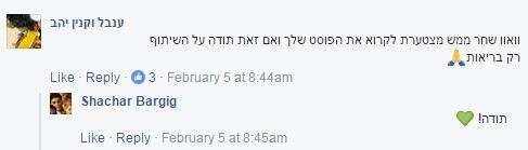 "אני רוצה להודות על כל התמיכה. זה ממש לא מובן מאליו. ציפיתי ללייקים ושיתופים של המשפחה והמעגל המצומצם אבל לא חשבתי לרגע שזה יהפוך לכל כך ויראלי. הרבה אנשים שולחים גם הודעות פרטיות, כותבים, תומכים, עוזרים. חשוב לי שהורים ידעו מצד אחד לא להיכנס ללחץ, אבל מצד שני לעשות את הבדיקה הפשוטה הזו ואולי להציל", סיכם.