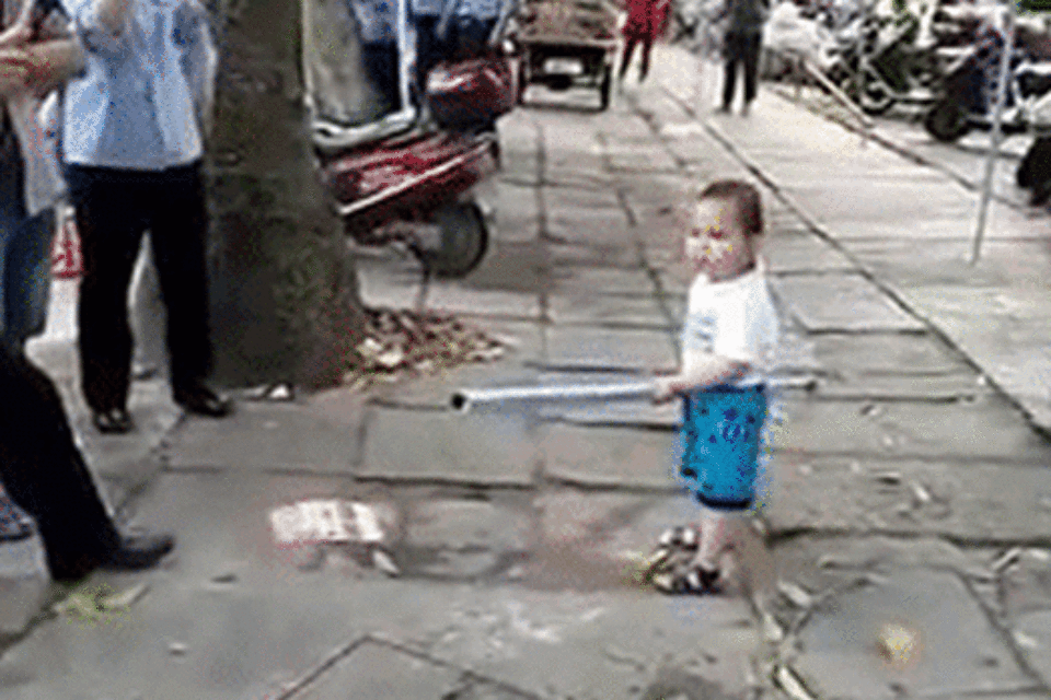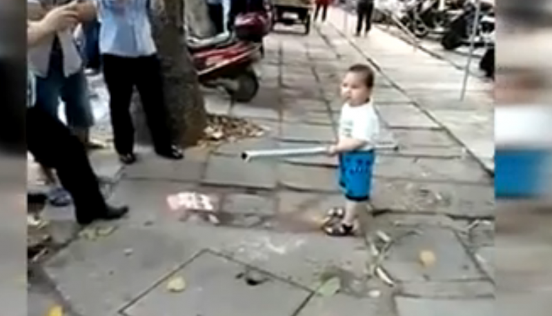 הפעוט תועד על ידי עוברי אורח בסין כשהוא מנסה להילחם בכל כוחו וגופו הקטן בקציני סיור עירוני, שהגיעו כנראה לפנות את סבתו שהקימה דוכן מכירה בלתי חוקי ברחוב.