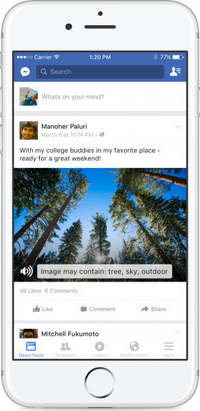 מהיום, המשתמשים בתוכנות קוראי מסך במכשירי iOS יוכלו לשמוע רשימה של פריטים אשר התמונה עשויה להכיל כאשר יעברו ויחליקו בין תמונות בפייסבוק.