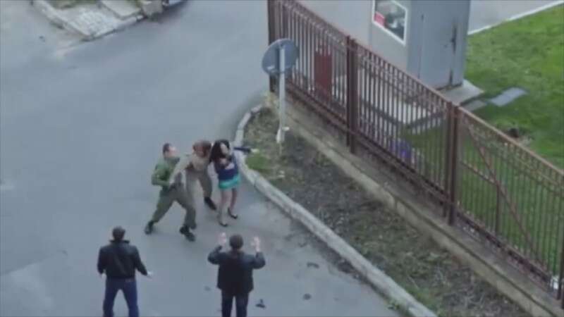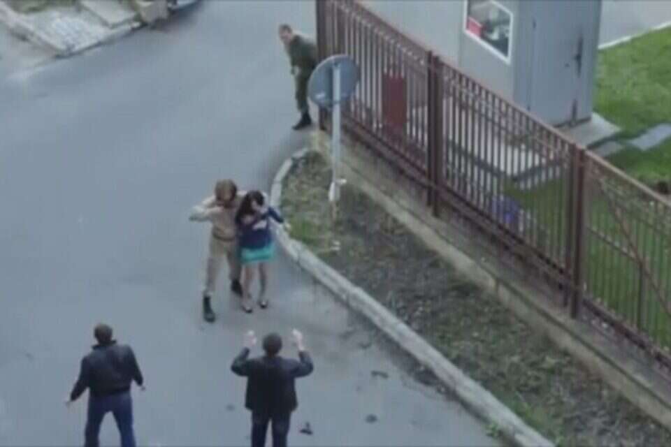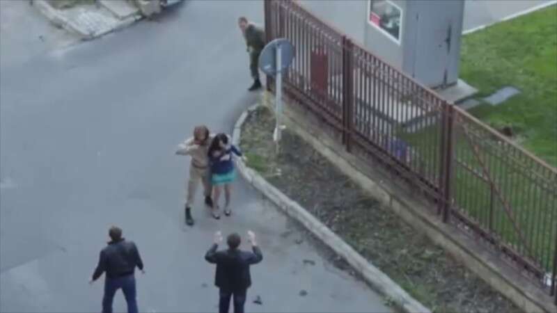 חייל רוסי שהבחין בבחורה המוחזקת על ידי גבר שמאיים לירות בה, תקף את ה"חוטף" והציל את האישה. הדבר היחיד שהוא לא ידע, הוא שמדובר בסצנה מבוימת.