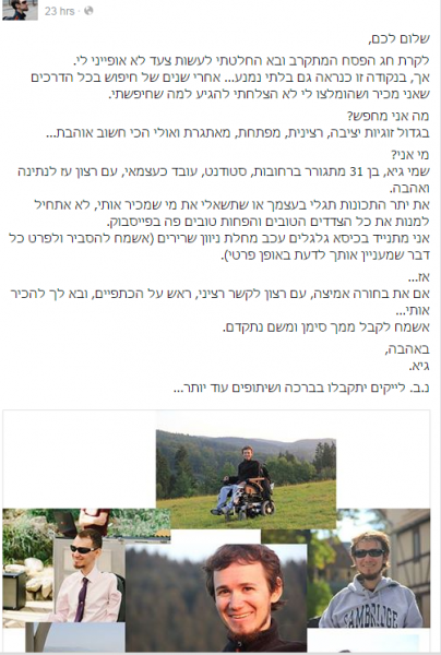 הפוסט המרגש זכה כבר למאות שיתופים, ואנחנו מזמינים גם אתכם לעשות את המעשה הטוב שלכם לחג, לשתף את פנייתו של גיא ואולי לעזור לו למצוא את האחת.