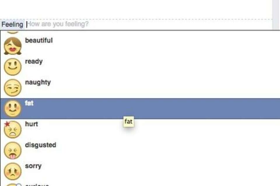 לפעמים גם פייסבוק עוברת את הגבול: כולנו מכירים את שורת הסטטוס – "אני מרגיש....", בה יכול הגולש לתאר את מצב רוחו או הרגשתו גם באמצעות סוגים שונים של אמוג'י – פרצופי סמיילי. בין שלל האפשרויות ניתן בין היתר לעשות שימוש סמיילים המבטאים: "גועל, שמחה, היעלבות, שיכרות ואפילו שובבות. בימים האחרונים החליטו בפייסבוק לייצר סמיילי חדש - אני מרגיש שמן. הדבר גרם לסערה ברשת החברתית ומחאה גדולה של עשרות אלפי גולשים.