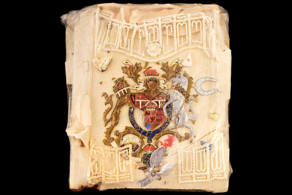 השריד האחרון מהעוגה שמעוטרת בסמלי בית המלוכה הבריטי יוצע במחיר נמוך במיוחד • העוגה הוקפאה ונשמרה במצב הראשוני שלה, מה שמאפשר לאמיצים לנסות לטעום ממנה גם היום