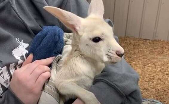 רק כעת, לאחר שהוצאנו אותו בפעם ראשונה כדי לשקול ולבדוק אותו, גילינו הפתעה שלא ציפינו לה. מסתבר שלזוג ההורים, בומר ורוזי, נולד קנגורו לבקן עם עיניים שחורות מיוחדות. על פי כל מה שידוע לנו זה הקנגורו הלבקן היחידי בכל ארה"ב. אנחנו לא יודעים הרבה על לבקנות בקרב המין הזה ולכן אנחנו מקיימים התייעצות נרחבת עם מומחים כדי לדעת איך לטפל בו והאם יש בעיות גנטיות שצריך לשים אליהן לב".