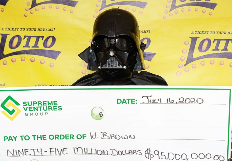 אדם שזכה ב-95 מיליון דולרים ג'מייקנים, הגיע לקבל את הפרס בתחפושת של לא אחר מאשר הלורד האייקוני דארת' וידר, מסדרת הסרטים המצליחה