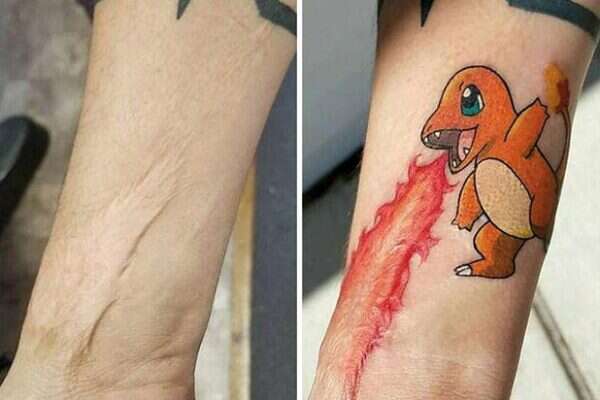 אומן קעקועים מצא פתרון יצירתי לצעיר שסבל מצלקת ארוכה ובולטת בזרועו • באמצעות ציור של צ'רמנדר, אחת מדמויות פוקימון, הוא הצליח להסוות את הכתם לחלוטין