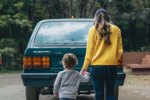 אמא וילד פעוט הולכים מאחורי סובארו ליאונה, כנראה הרכב הנפוץ בישראל בשנות ה-90. צילום: מערכת feedy באמצעות הבינה המלאכותית ideogram