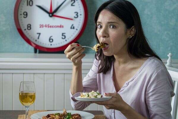 אישה אוכלת ארוחת ערב במהירות. צילום: מערכת feedy באמצעות הבינה המלאכותית ideogram