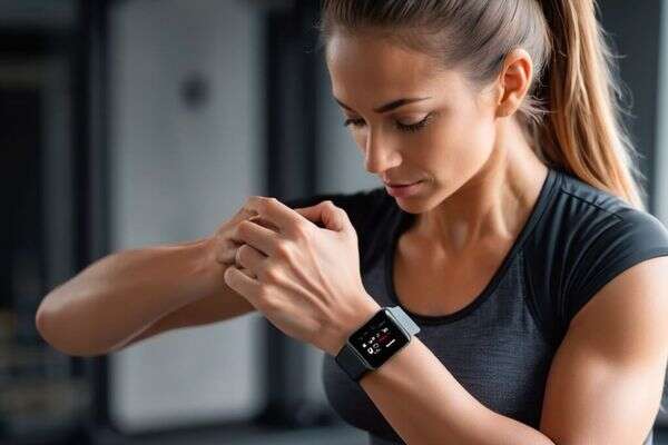 אישה בבגדי אימון ושעון כושר חכם. צילום: מערכת feedy באמצעות הבינה המלאכותית Leonardo.Ai