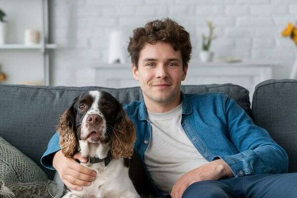 בחור צעיר רובץ עם כלב הספניאל שלו על הספה. צילום: מערכת feedy באמצעות הבינה המלאכותית ideogram