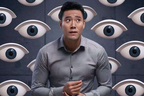 גבר פרנואיד מוקף עיניים גדולות שצופות בו. צילום: מערכת feedy באמצעות הבינה המלאכותית ideogram