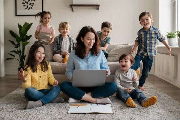 אישה עובדת מהבית בזמן שששת ילדיה משחקים סביבה. צילום: מערכת feedy באמצעות הבינה המלאכותית ideogram
