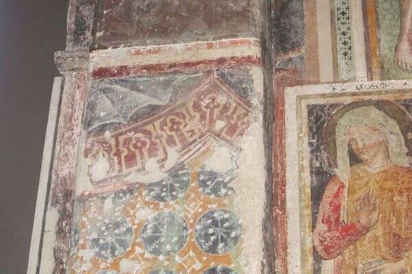 הפרסקו צויר בין סוף המאה ה-13 לתחילת המאה ה-14 כדי לייצג חופה מעל המזבח הראשי. האמן הפך את הגומחה לאוהל, המורכב מווילון כחול וזהוב העוטף את שלושת הקירות, ומעליו חופה קונית משובצת אבני חן בשני מפלסים, בסגנון שהיה נפוץ בעולם האסלאמי. הרקע היה שמיים כחולים מכוסים בכוכבים וציפורים, היוצרים אשליה של אוהל הניצב תחת כיפת השמיים. במאה ה-15 המוקדמת, חלק מהפרסקו נצבע מחדש בסצנות מחיי מרים הבתולה וישו, אך חלקים מהפרסקו המקורי נותרו גלויים.