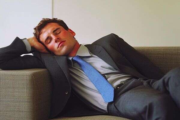 גבר בחליפה ישן שנץ צהריים על ספה במשרד. צילום: מערכת feedy באמצעות Midjourney