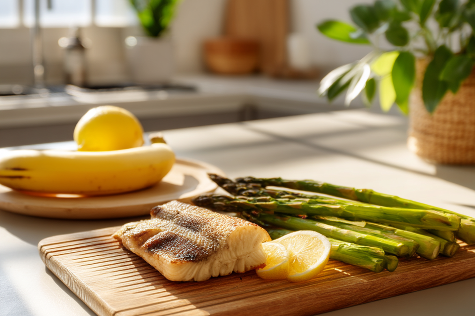 מזין ומאוזן: פילה דג צלוי לצד אספרגוס ובננה 🍌🐟🥦 - תזונה ים-תיכונית עשירה בחלבונים רזים, שומנים בריאים ופחמימות מורכבות בדיוק כפי שמומלץ למניעת מיגרנות! 🧠💆♀️. צילום: מידג'רני